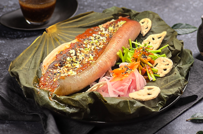 가오리 날개를 연잎에 정성껏 싸 올리고, 비법 소스를